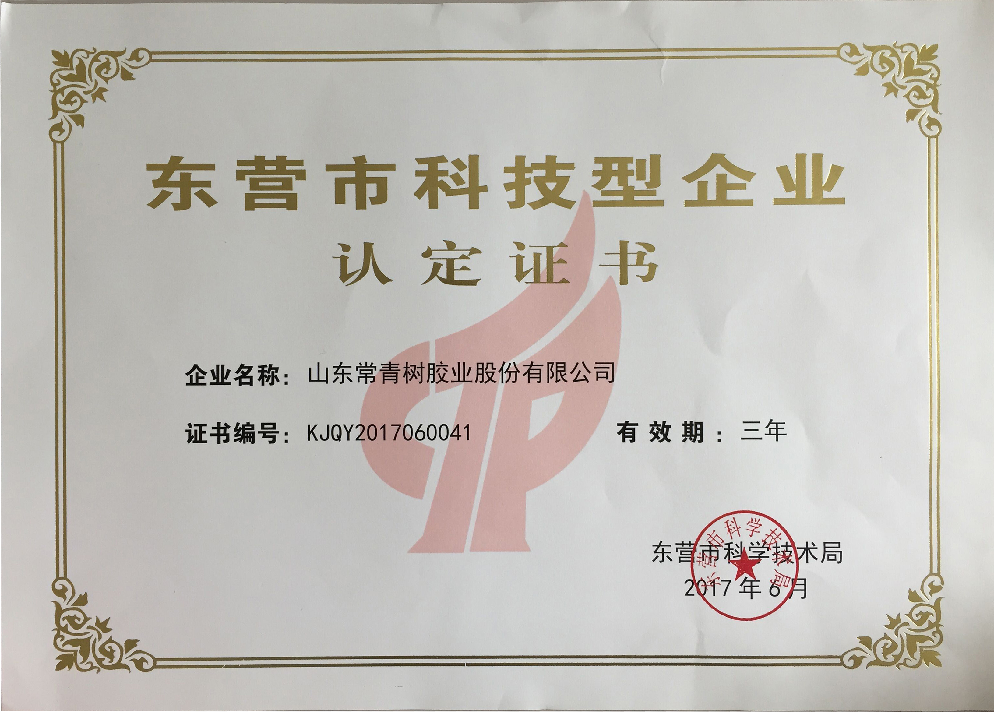 2017年,東營市科技型企業(yè)認(rèn)定證書
