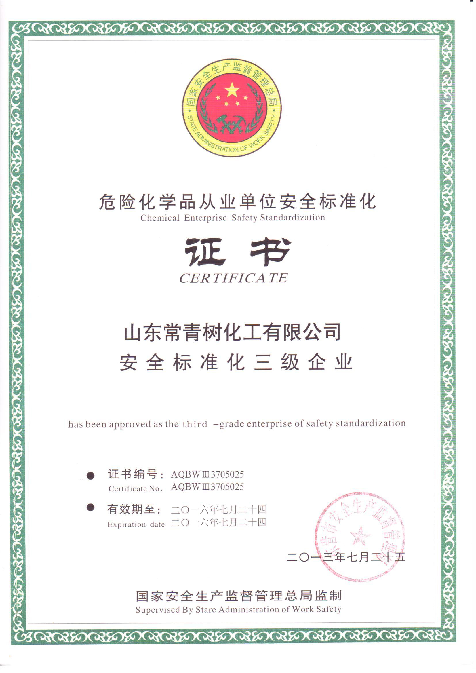 2013年,安全標(biāo)準(zhǔn)化三級(jí)企業(yè)達(dá)標(biāo)證書(shū)